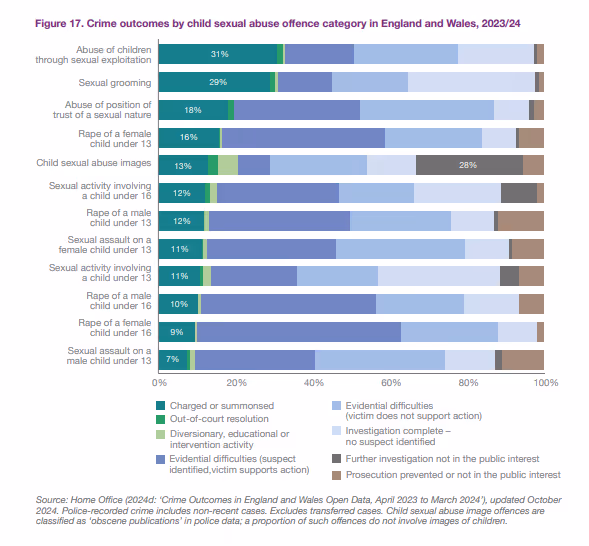 - The outcome of the remaining 59% of cases were resolution via out-of-court measures, diversion programmes, evidential difficulties, or incomplete investigations.